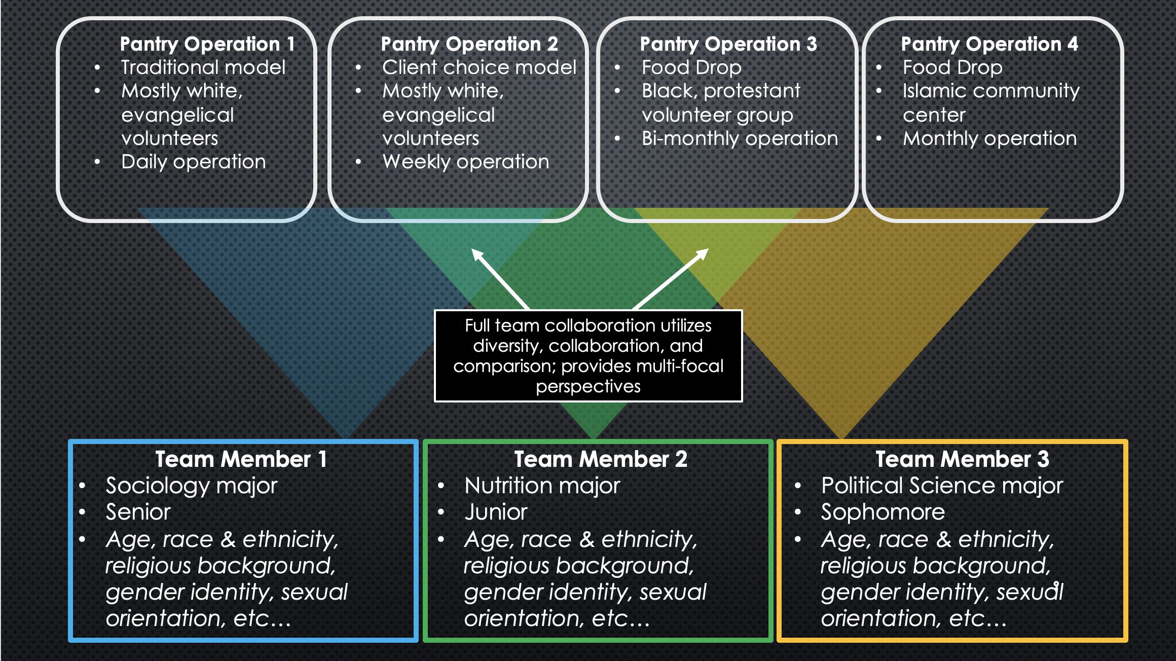 My work facilitates collaborative, interdisciplinary, undergraduate research teams. In this innovative team-based design, I select and train diverse groups of students in ethnographic methods and sociological topics, and perform research with them. In leading these teams, I have secured $20,000 in funding from the Louisville Institute (Project Grant, 2020) to compensate the students for their work. I also structure my courses to follow this same team-based pedagogical model.